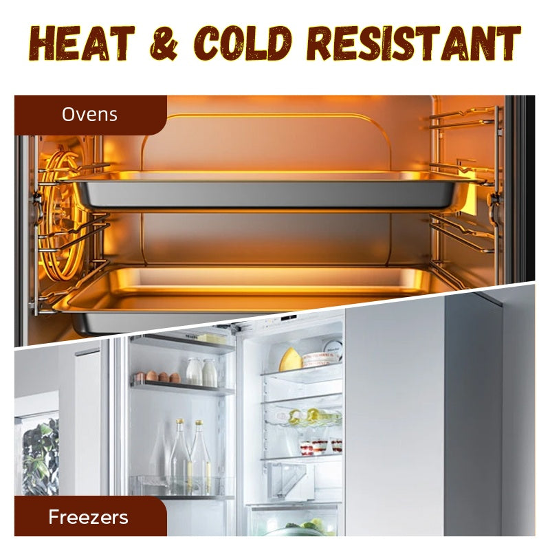 ODPORNOŚĆ NA WYSOKIE TEMPERATURY I ZAMRAŻANIE: Wytrzymuje szeroki zakres temperatur, dzięki czemu idealnie nadaje się zarówno do piekarników, jak i zamrażarek, nie ulegając wypaczeniu ani pęknięciu.